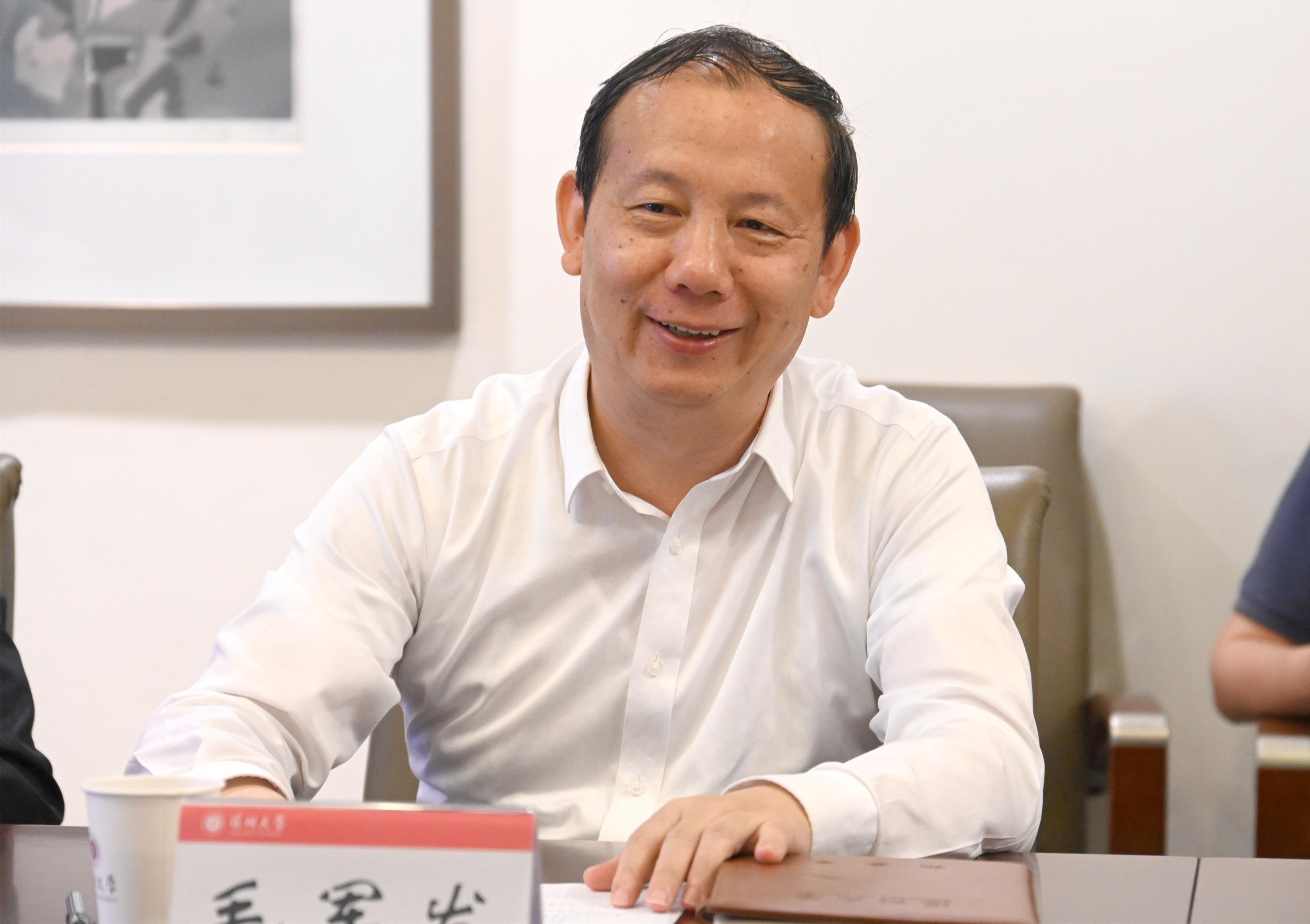 毛军发首先对张晓春一行冒着风雨前来调研表示欢迎与感谢,并简要介绍了深圳大学的校企合作、科研发展等情况。他表示,深圳大学的未来发展将深度融入地方经济社会发展中,为深圳、粤港澳大湾区乃至全国的经济发展作出贡献。深圳大学将与众多致力于特区、大湾区和国家发展的企业开展深度合作,建设地方、国家层面的重点研究基地,承担重要研发任务,为经济社会发展提供智力支持,真正把高校的人才培养、科学研究、社会服务等责任落到实处。毛军发表示,深圳大学将全力支持与深智城的合作,按照国家工信部、科技部等部门的要求创新合作方式,在将双方单位的基础创新中心建设好的同时,加强从基础科研到人才培养的全方位战略合作,实现双方优势互补。