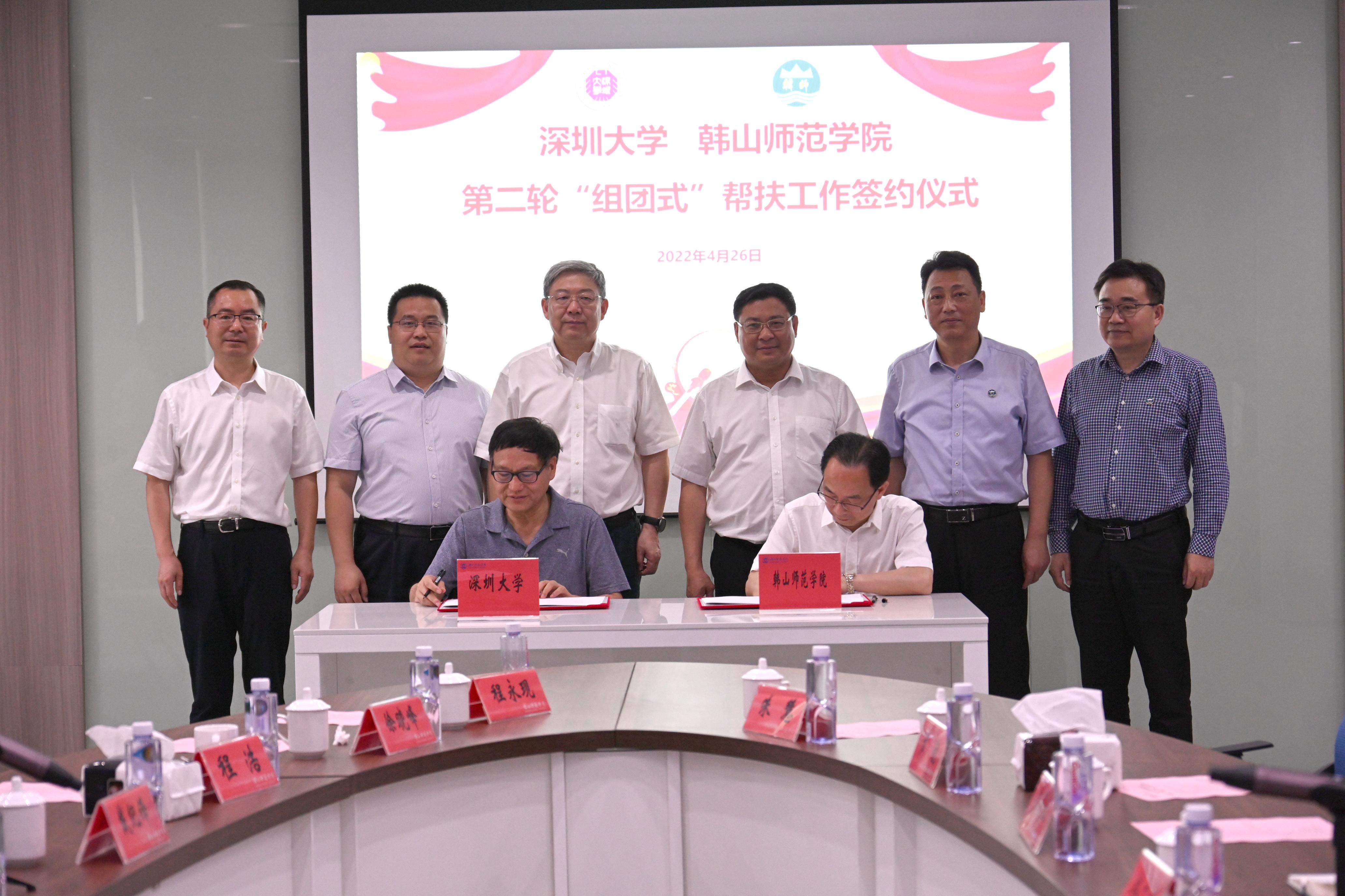 4月26日,深圳大学党委书记李清泉、副校长张学记率队前往韩山师范学院,欢送学校教育人才“组团式”帮扶工作队。韩山师范学院(以下简称“韩师”)党委书记幸小涛、校长陈树思、党委副书记林广文热情接待,双方就新一轮帮扶工作举行座谈并签署新一轮帮扶协议。
