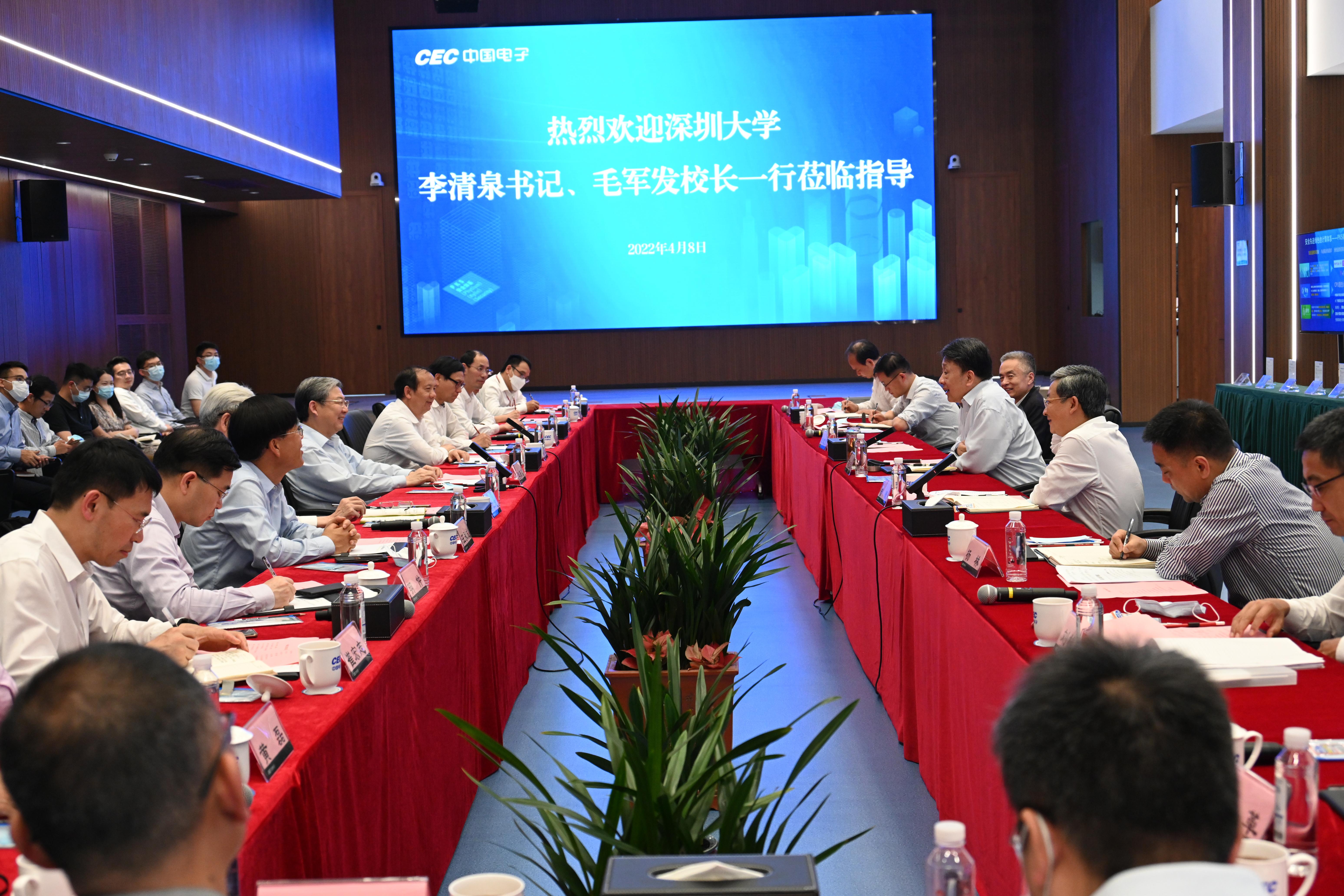 4月8日下午,深圳大学党委书记李清泉,校长毛军发,深圳大学特聘教授、中国工程院院士郭仁忠,副校长张学记、汪永成率队参观访问世界500强央企——中国电子信息产业集团有限公司(简称“中国电子”),并开展校企座谈会,双方就进一步深化校企合作进行交流。