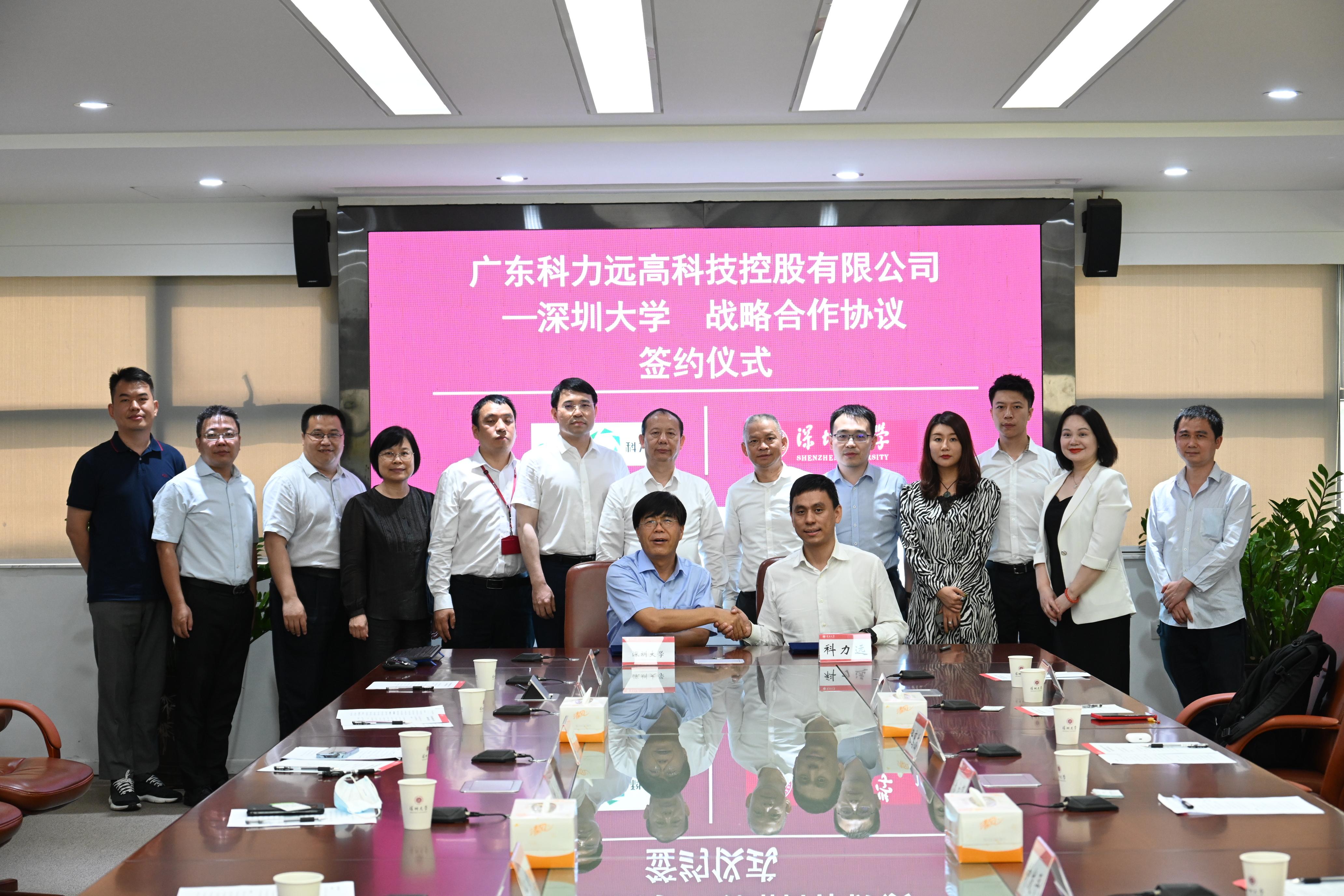 随后,汪永成、潘立贤分别代表双方签订《广东科力远高科技控股有限公司—深圳大学战略合作协议》,钟发平、毛军发见证签约。双方人员合影留念。